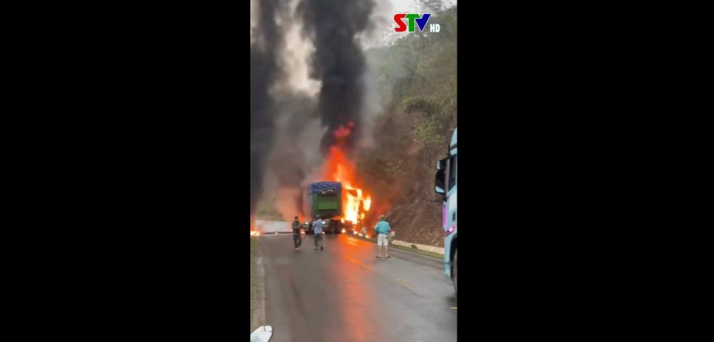 • Trên quốc lộ 6 đoạn qua bản Đông Khùa, xã Chiềng Hặc, 1 xe đầu kéo bị tai nạn và bốc cháy